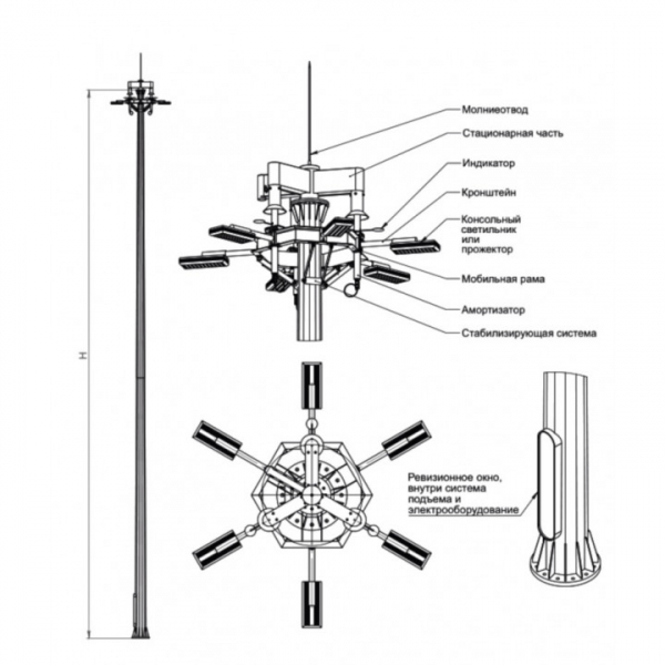 Высота высокомачтовых опор МГФ 20 метров. Их грузоподъёмность составляет до 800 кг. Количество прожекторов в каждой опоре — до 12 штук.